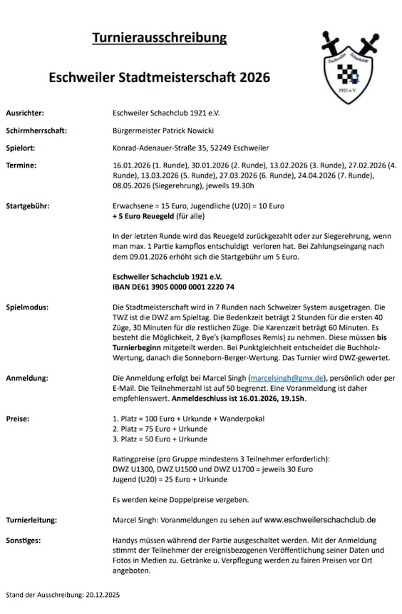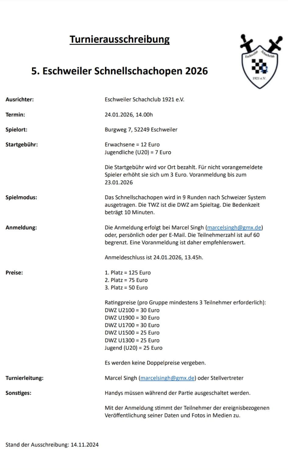 16.11.2024 - Ausschreibung Eschweiler Schnellschachopen 2024