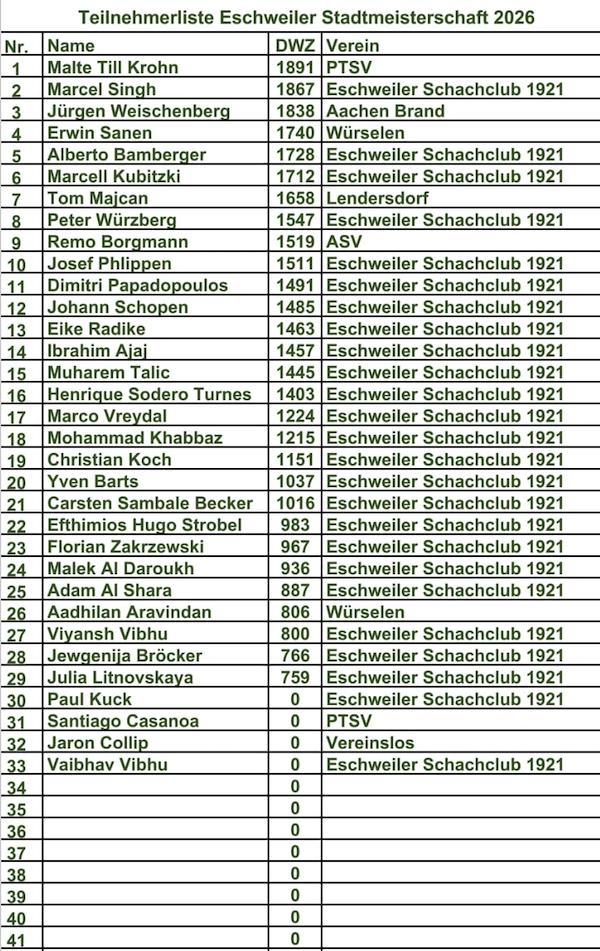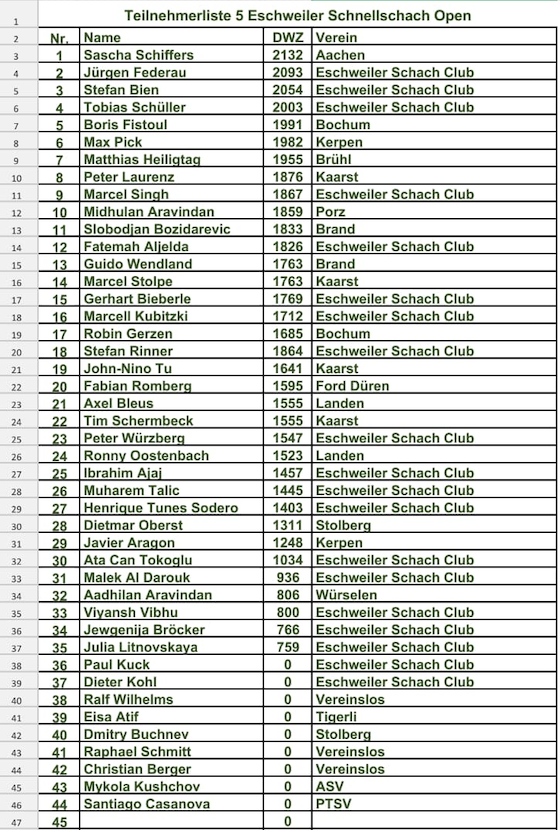 02.12.2024 - Aktuelle Teilnehmerliste Eschweiler Schnellschachopen 2024